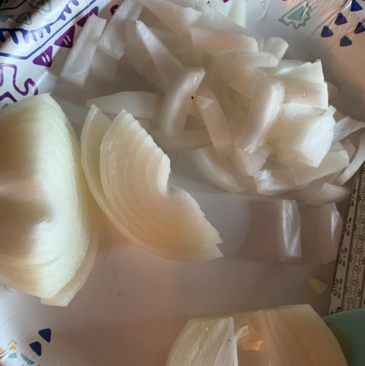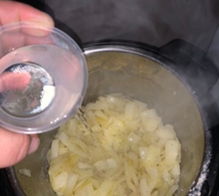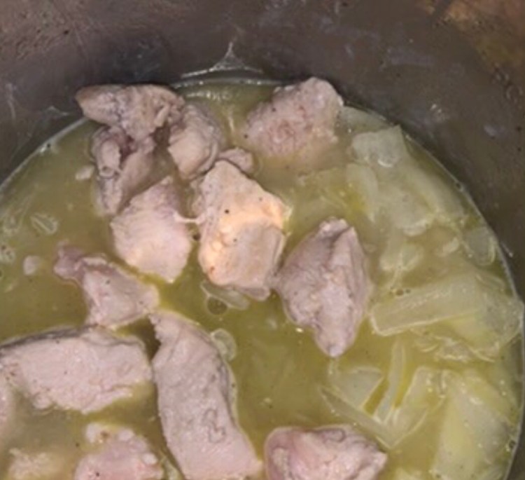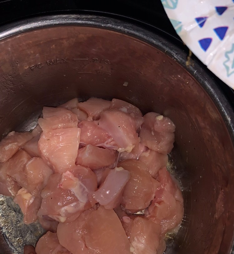 Ok gather your ingredients, chop up your chicken and start sautéing the chicken in some oil or butter. Meanwhile chop up the onions. Remove browned chicken to a plate, add onions and sauté. Once translucent I added 1 cup of water to help pressurize the system, and added chicken back in. Then push cancel to turn off sauté and turn to pressure cooker set for 25 mins.